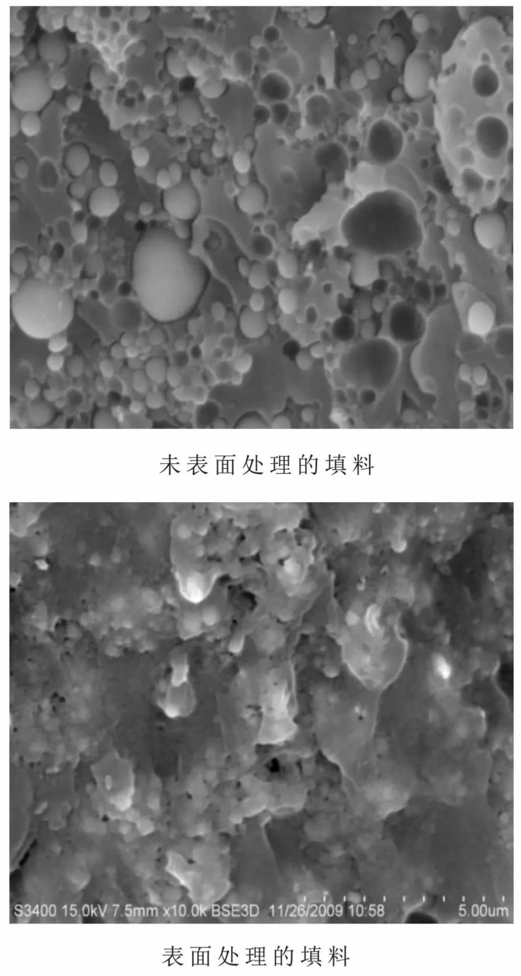 ▲未經(jīng)過表面處理和經(jīng)過表面處理的填料在樹脂中填充固化后的界面情況