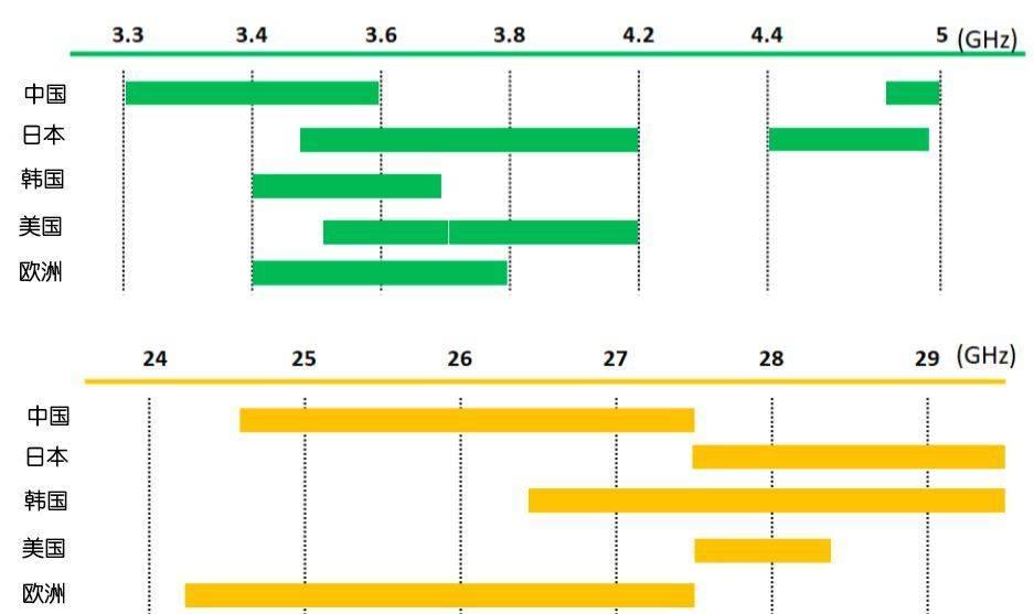 目前,3.5GHz(3.3GHz—4.2GHz)和28GHz(24.25GHz—29.5GHz)頻段全球最熱門。