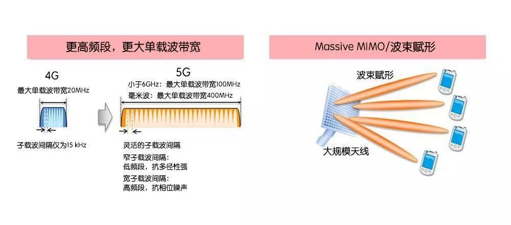 在速率上,5G主要依靠增大單載波帶寬提升,并通過Massive MIMO技術(shù)進一步提升網(wǎng)速和增強覆蓋。
