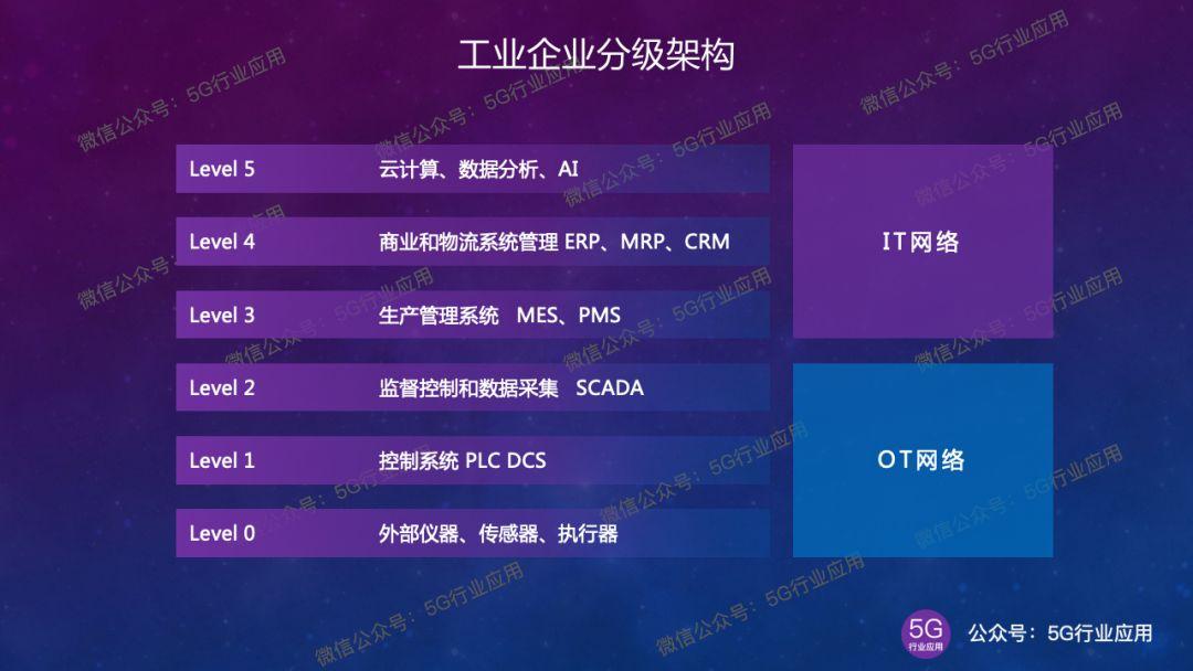 工業(yè)企業(yè)的OT(Operation Technology)和IT(Information Technology)系統(tǒng)采取分級(jí)架構(gòu)。其中OT系統(tǒng)從下往上包括Level 0級(jí)外部?jī)x器、傳感器、執(zhí)行器等;Level 1級(jí)控制系統(tǒng)PLC,DCS等;Level 2級(jí)監(jiān)督控制和數(shù)據(jù)采集SCADA。IT系統(tǒng)從下往上包括Level 3級(jí)生產(chǎn)管理系統(tǒng)MES、PMS;Level 4級(jí)商業(yè)和物流系統(tǒng)管理ERP、MRP、CRM等;Level 5級(jí)云計(jì)算、數(shù)據(jù)分析和AI等。5G的無(wú)線接入技術(shù)和網(wǎng)絡(luò)技術(shù)對(duì)OT和IT系統(tǒng)的支撐,將從架構(gòu)底層向上層逐步延伸。